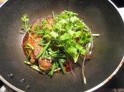 9.汁收干之前打开锅盖,放入九层塔以及香菜葱段,盖上锅盖焖片刻再打开,淋上少许芝麻油后盛入盘中即可食用。